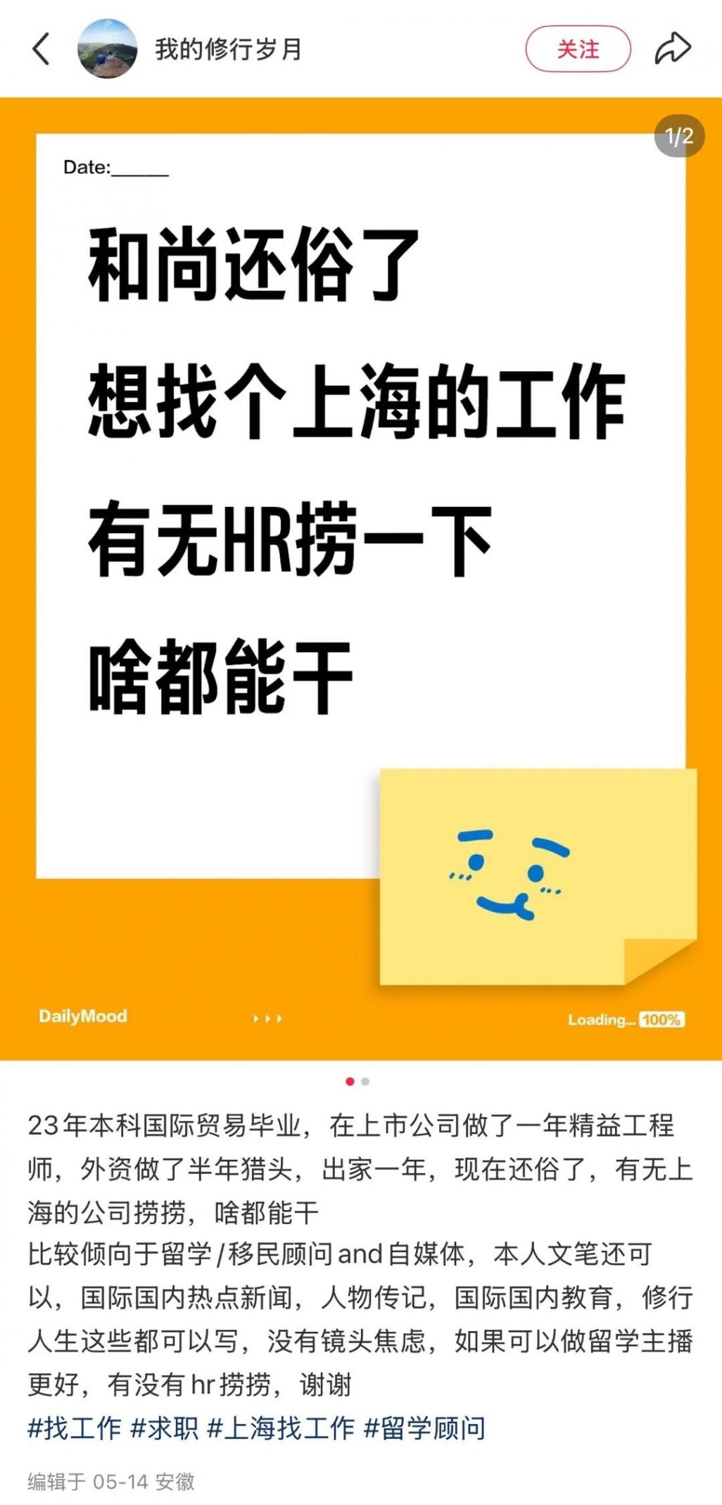 “2023年本科國際貿(mào)易畢業(yè),在上市公司做了一年精益工程師,外資做了半年獵頭,出家一年,現(xiàn)在還俗了,有無上海的公司撈撈,啥都能干。”
