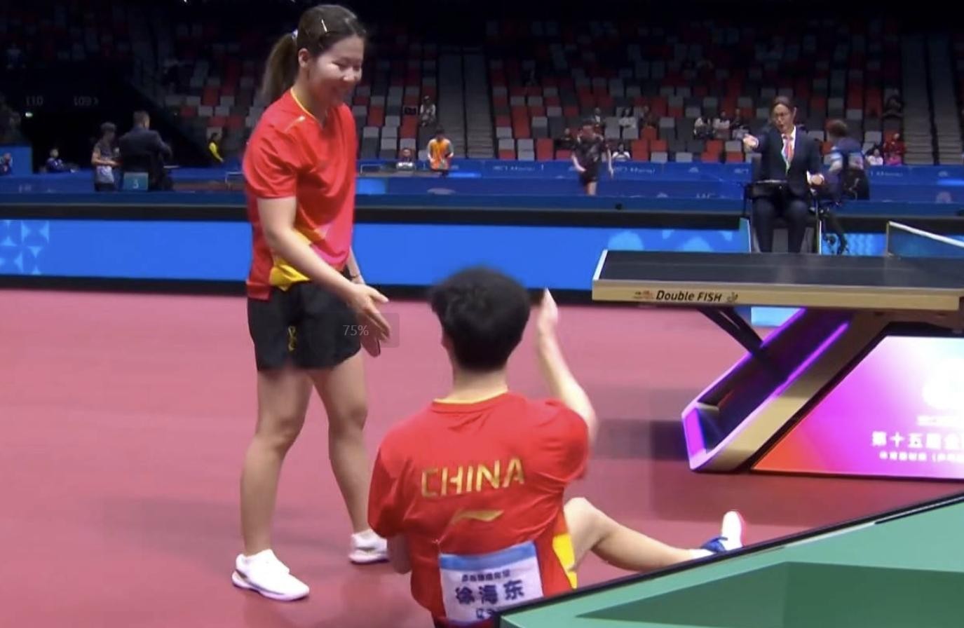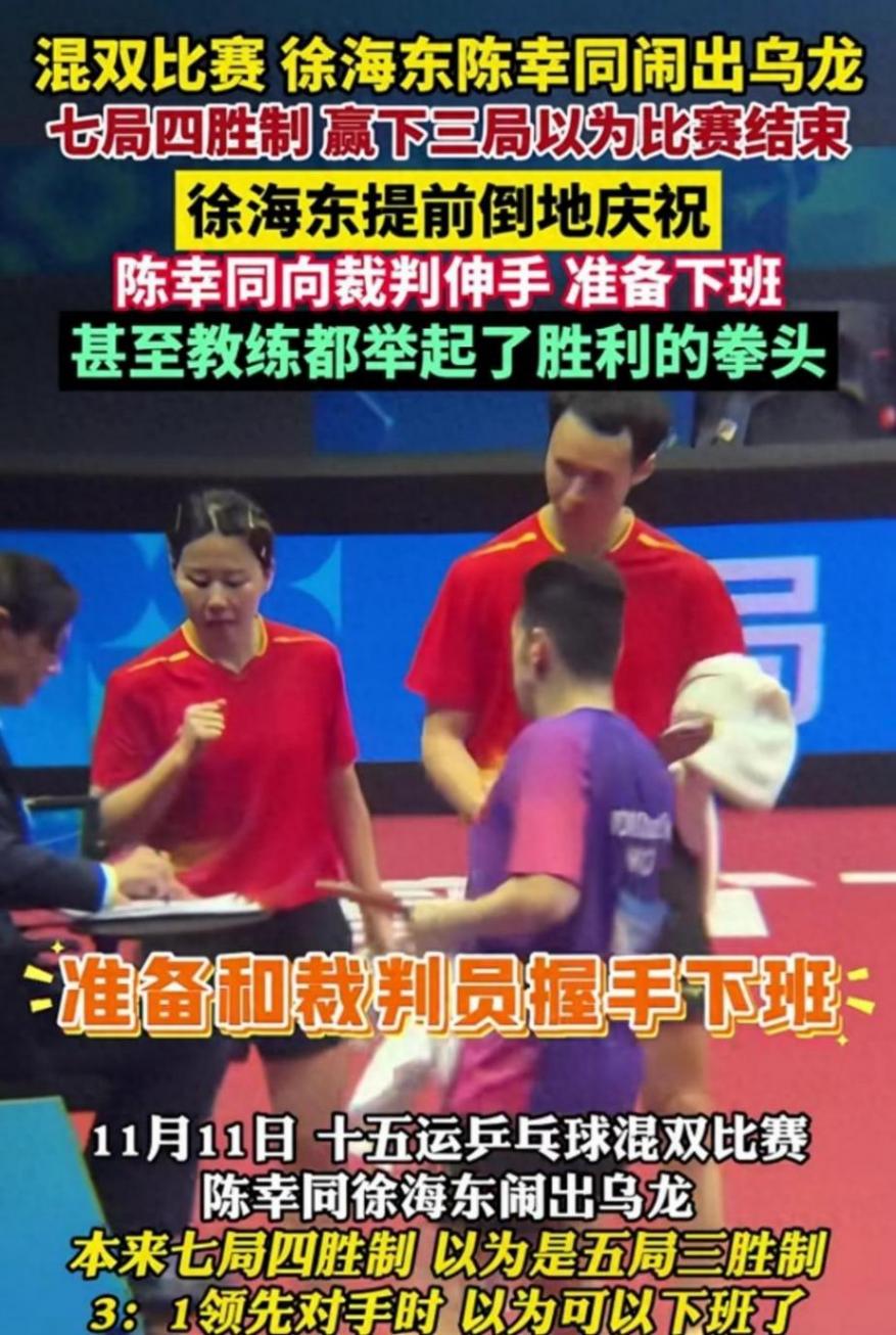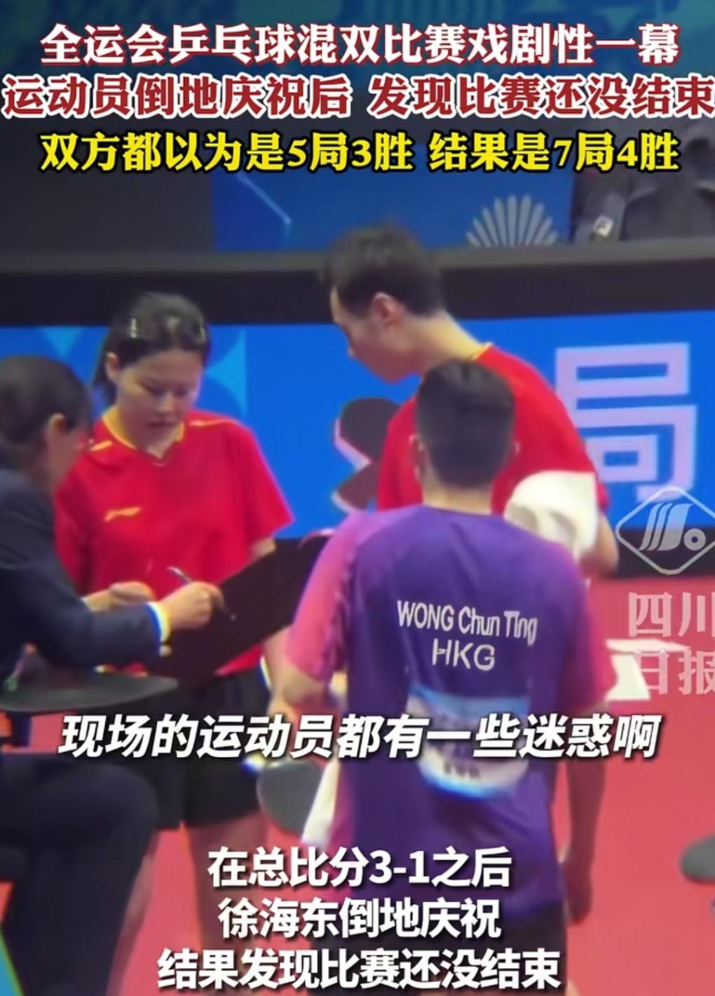 當時打到第4局,徐海東和搭檔陳幸同拿下本局后直接躺倒在地。對手以為比賽真結束了,兩隊隊員當場握手告別,裁判也被拉去確認規則。解說員也跟著愣住,以為該轉場了。最后發現烏龍后,所有人重新上場繼續打。